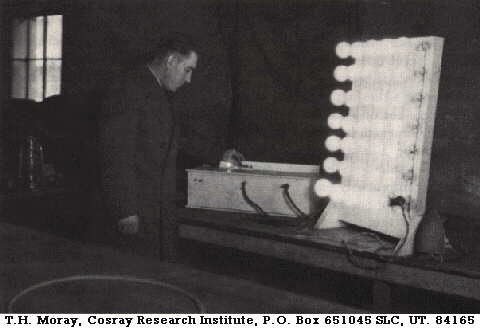 Ein bedeutendes Dokument: Aufnahme vom Februar 1937. Dr. Henry Moray speist mit seinem Konverter 35 elektrische Birnen von je 100 Watt Leistungsaufnahme, zusammen also 3,5 KW. Der von Ihm gebaute Konverter wog 25 kg. Er mußte an ein starkes isoliertes Kabel angeschlossen werden, welches im Garten ausgelegt wurde (sog. Antenne). Wurde die "Antenne" abgekoppelt, erlosch die Funktion des Konverters.
